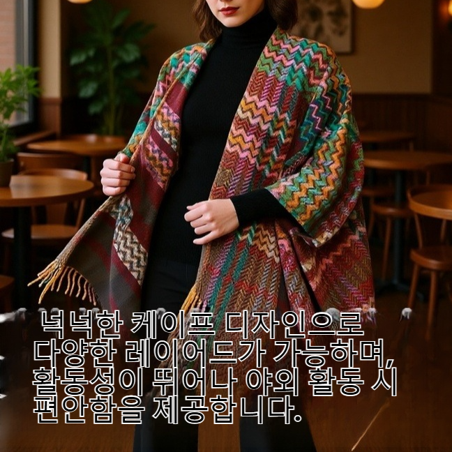 ● 넉넉한 케이프 디자인으로 다양한 레이어드가 가능하며, 활동성이 뛰어나 야외 활동 시 편안함을 제공합니다.