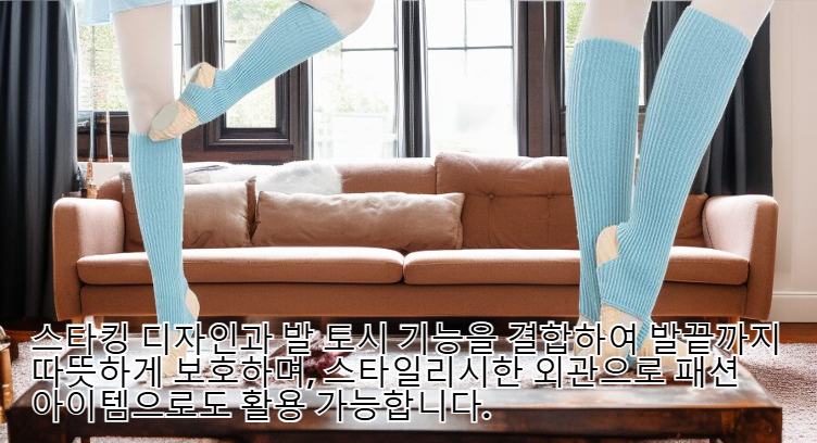 ● 스타킹 디자인과 발 토시 기능을 결합하여 발끝까지 따뜻하게 보호하며, 스타일리시한 외관으로 패션 아이템으로도 활용 가능합니다.